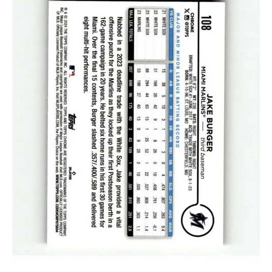 2024 Topps Chrome Refractor Pink #108 Jake Burger NM-MT Miami Marlins Baseball Card