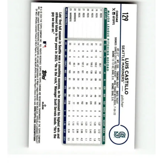2024 Topps Chrome Refractor Pink #129 Luis Castillo NM-MT Seattle Mariners Baseball Card