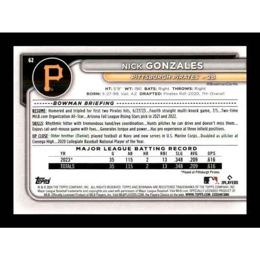 2024 Bowman #62 Nick Gonzales NM-MT RC Rookie Pittsburgh Pirates Baseball Card