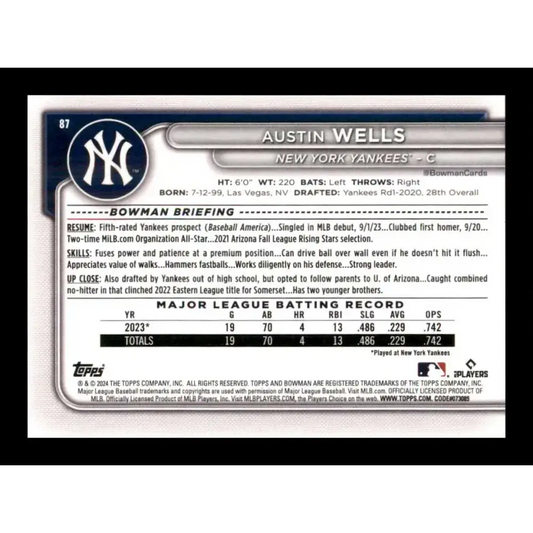 2024 Bowman #87 Austin Wells NM-MT RC Rookie New York Yankees Baseball Card