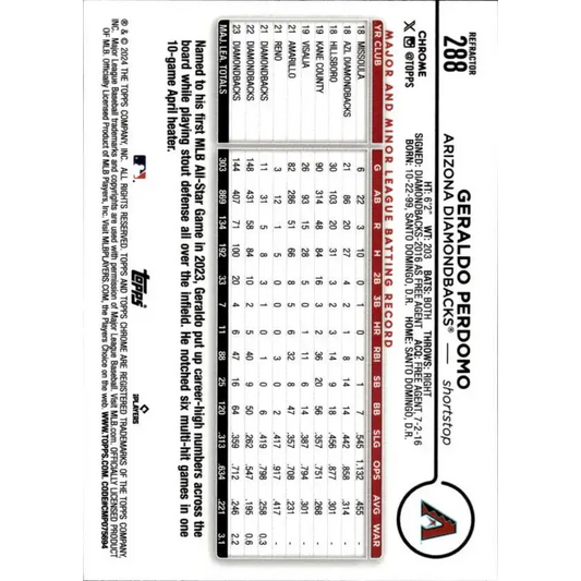 2024 Topps Chrome Refractor #288 Geraldo Perdomo NM-MT Arizona Diamondbacks Baseball Card