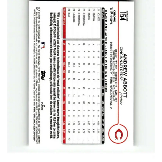 2024 Topps Chrome Refractor #154 Andrew Abbott NM-MT RC Rookie Cincinnati Reds Baseball Card