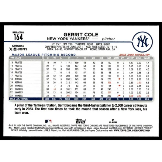2024 Topps Chrome Refractor #164 Gerrit Cole NM-MT New York Yankees Baseball Card