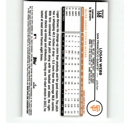 2024 Topps Chrome Refractor #168 Logan Webb NM-MT San Francisco Giants Baseball Card