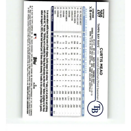2024 Topps Chrome Refractor #209 Curtis Mead NM-MT RC Rookie Tampa Bay Rays Baseball Card