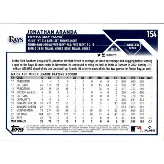 2023 Topps #154 Jonathan Aranda NM-MT RC Rookie Tampa Bay Rays Baseball Card