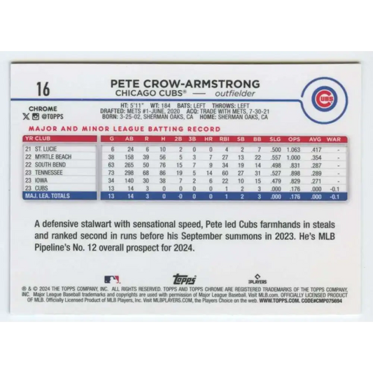 2024 Topps Chrome #16 Pete Crow-Armstrong NM-MT RC Rookie Chicago Cubs Baseball Card