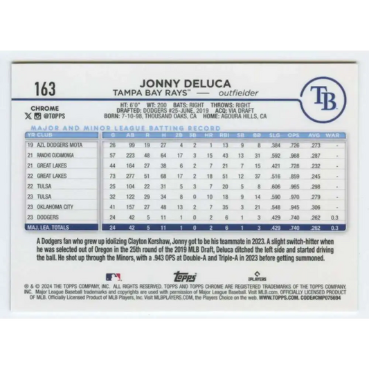 2024 Topps Chrome #163 Jonny Deluca NM-MT RC Rookie Tampa Bay Rays Baseball Card