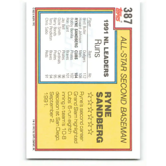 1992 Topps #387 Ryne Sandberg EX Excellent Chicago Cubs Baseball Card