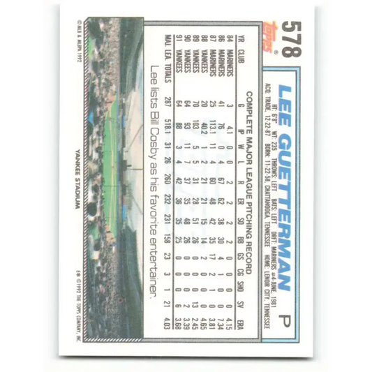 1992 Topps #578 Lee Guetterman EX Excellent New York Yankees Baseball Card