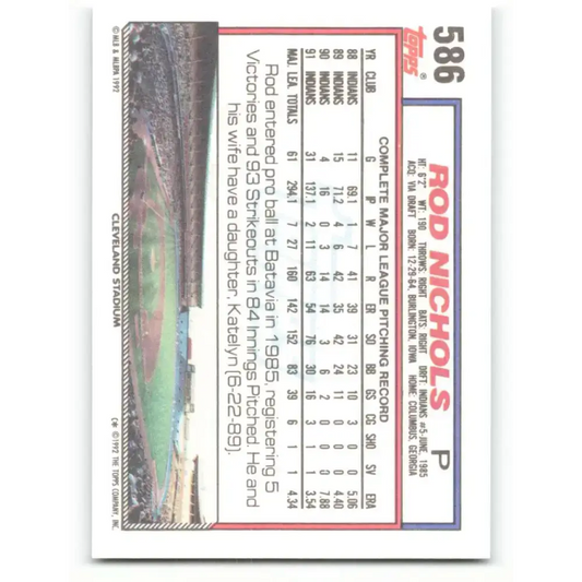 1992 Topps #586 Rod Nichols EX Excellent Cleveland Indians Baseball Card