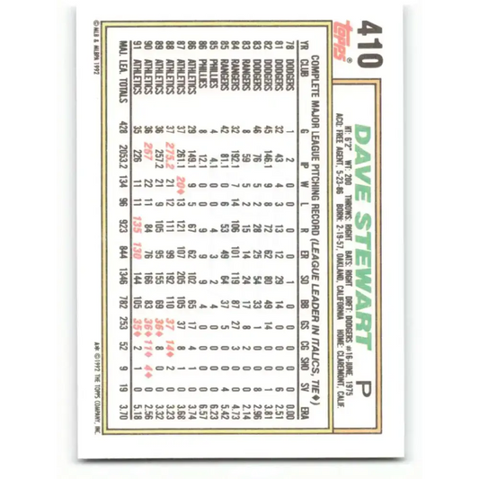 1992 Topps #410 Dave Stewart EX Excellent Oakland Athletics Baseball Card