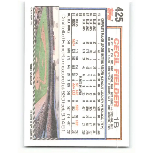 1992 Topps #425 Cecil Fielder EX Excellent Detroit Tigers Baseball Card