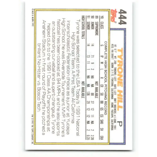 1992 Topps #444 Tyrone Hill EX Excellent RC Rookie Milwaukee Brewers Baseball Card