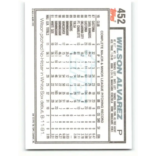 1992 Topps #452 Wilson Alvarez EX Excellent Chicago White Sox Baseball Card