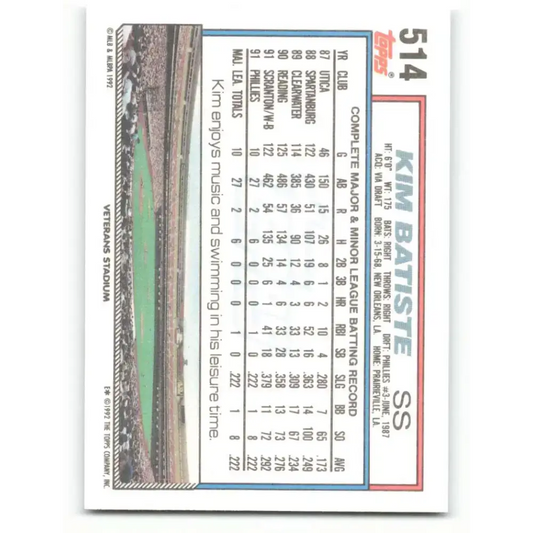 1992 Topps #514 Kim Batiste EX Excellent Philadelphia Phillies Baseball Card