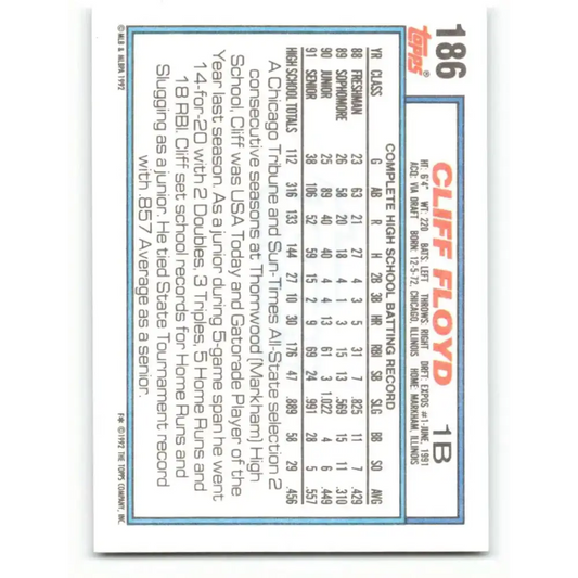 1992 Topps #186 Cliff Floyd EX Excellent RC Rookie Montreal Expos Baseball Card