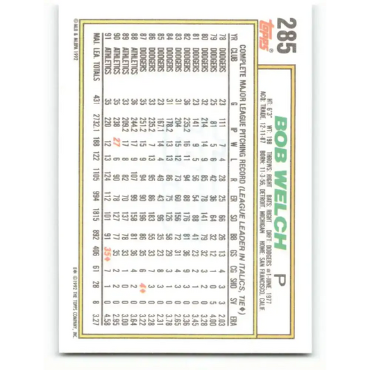 1992 Topps #285 Bob Welch EX Excellent Oakland Athletics Baseball Card