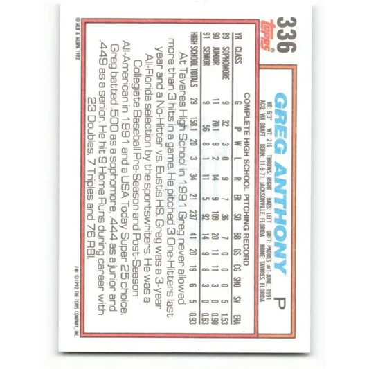 1992 Topps #336 Greg Anthony EX Excellent RC Rookie San Diego Padres Baseball Card