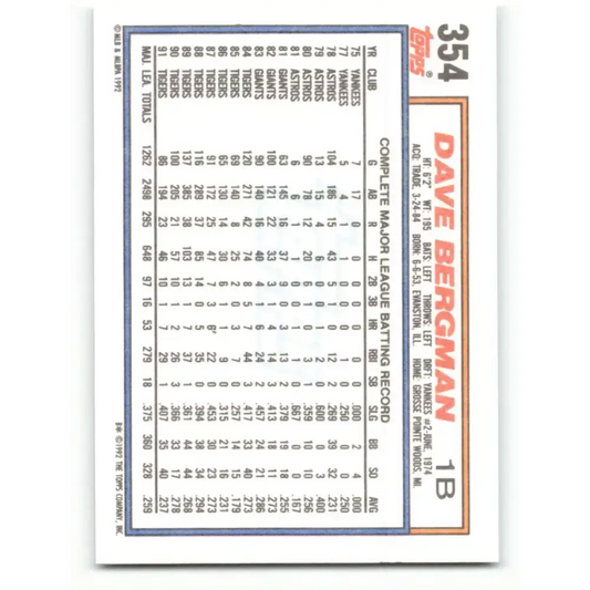 1992 Topps #354 Dave Bergman EX Excellent Detroit Tigers Baseball Card