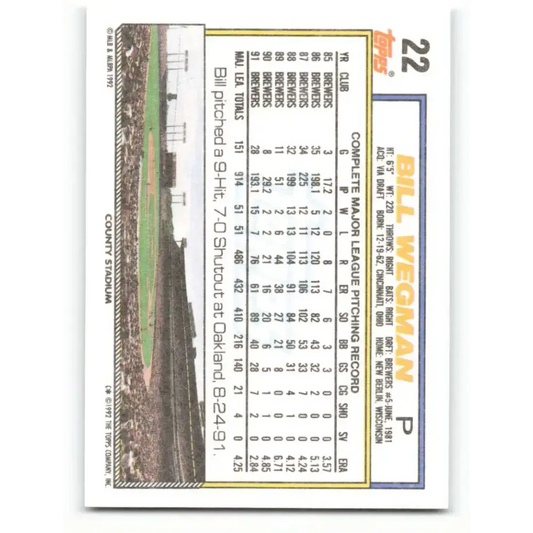 1992 Topps #22 Bill Wegman EX Excellent Milwaukee Brewers Baseball Card