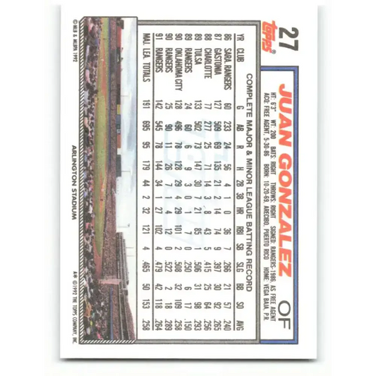 1992 Topps #27 Juan Gonzalez EX Excellent Texas Rangers Baseball Card