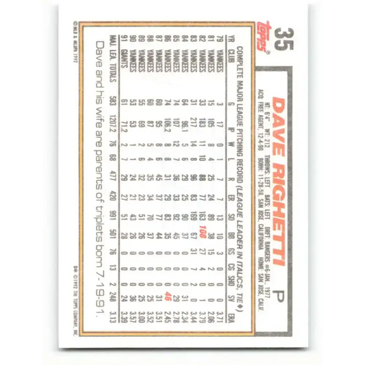 1992 Topps #35 Dave Righetti EX Excellent San Francisco Giants Baseball Card