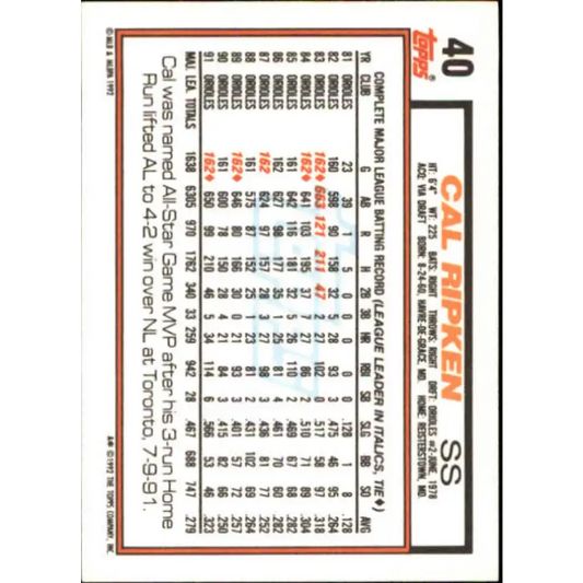 1992 Topps #40 Cal Ripken Jr. EX Excellent Baltimore Orioles Baseball Card