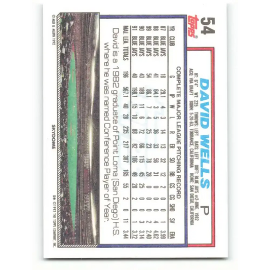 1992 Topps #54 David Wells EX Excellent Toronto Blue Jays Baseball Card