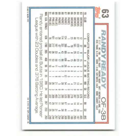 1992 Topps #63 Randy Ready EX Excellent Philadelphia Phillies Baseball Card