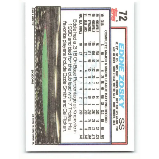 1992 Topps #72 Eddie Zosky EX Excellent Toronto Blue Jays Baseball Card