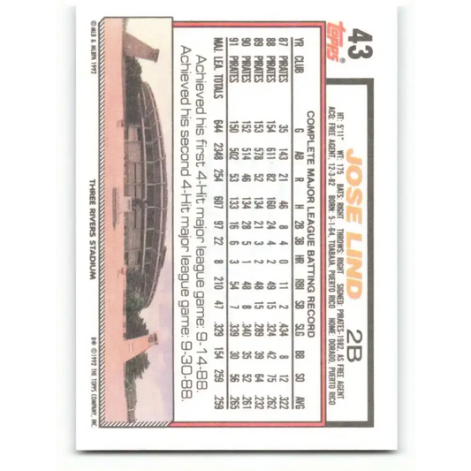 1992 Topps #43 Jose Lind EX Excellent Pittsburgh Pirates Baseball Card
