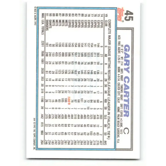 1992 Topps #45 Gary Carter EX Excellent Los Angeles Dodgers Baseball Card