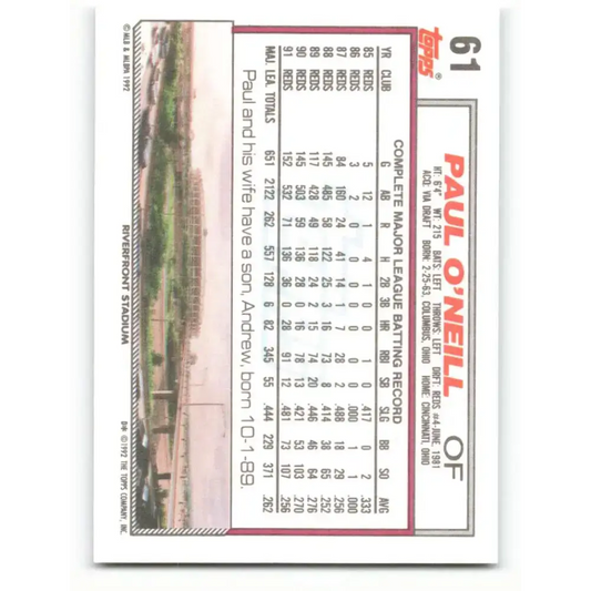 1992 Topps #61 Paul O'Neill EX Excellent Cincinnati Reds Baseball Card