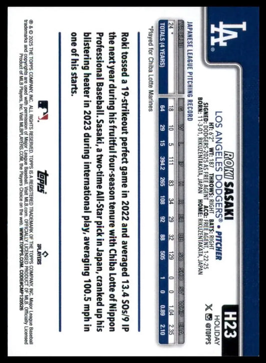 2025 Topps Holiday Roki Sasaki Rookie #H23 Los Angeles Dodgers Baseball Card MLB