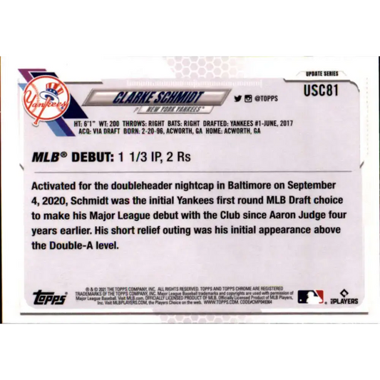 2021 Topps Chrome Update #USC81 Clarke Schmidt NM-MT RC Rookie New York Yankees Baseball Card