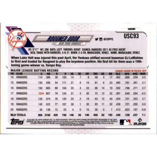 2021 Topps Chrome Update #USC93 Rougned Odor NM-MT New York Yankees Baseball Card