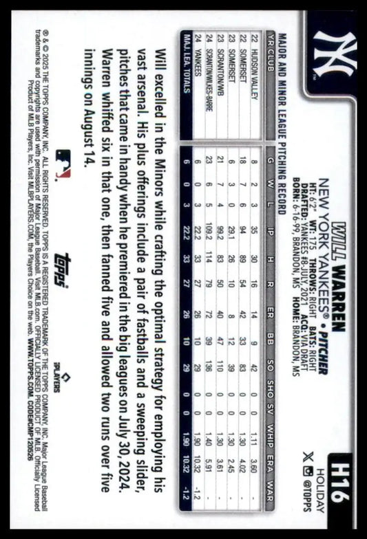 2025 Topps Holiday Will Warren Rookie #H16 New York Yankees Baseball Card MLB
