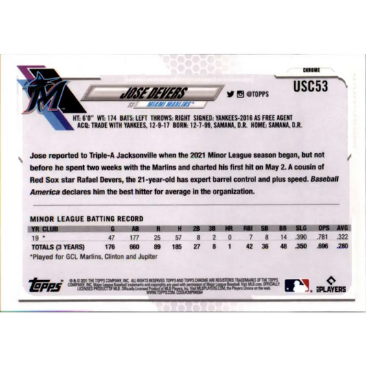 2021 Topps Chrome Update #USC53 Jose Devers NM-MT RC Rookie Miami Marlins Baseball Card