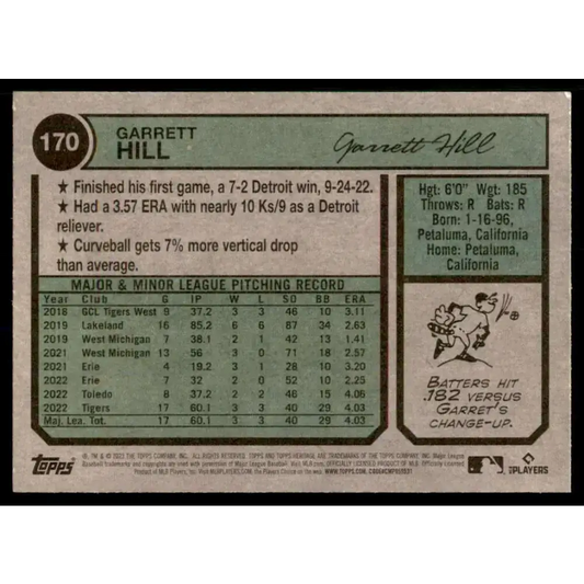 2023 Topps Heritage #170 Garrett Hill NM-MT RC Rookie Detroit Tigers Baseball Card