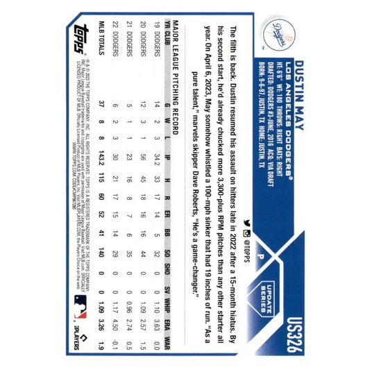 2023 Topps Update Series #US326 Dustin May NM-MT Los Angeles Dodgers Baseball Card