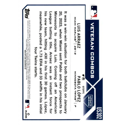 2023 Topps Update Series #US302 Pablo Lopez/Luis Arraez NM-MT Minnesota Twins/Miami Marlins Baseball Card