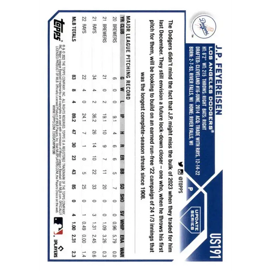 2023 Topps Update Series #US191 J.P. Feyereisen NM-MT Los Angeles Dodgers Baseball Card