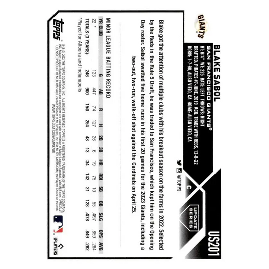 2023 Topps Update Series #US201 Blake Sabol NM-MT RC Rookie San Francisco Giants Baseball Card