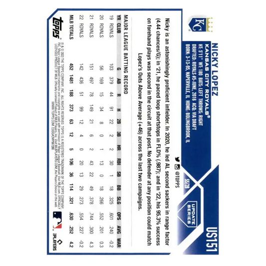 2023 Topps Update Series #US151 Nicky Lopez NM-MT Kansas City Royals Baseball Card