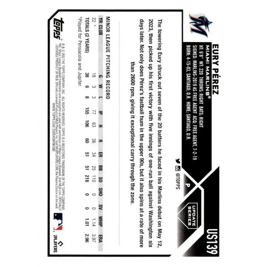 2023 Topps Update Series #US139 Eury Perez NM-MT RC Rookie Miami Marlins Baseball Card