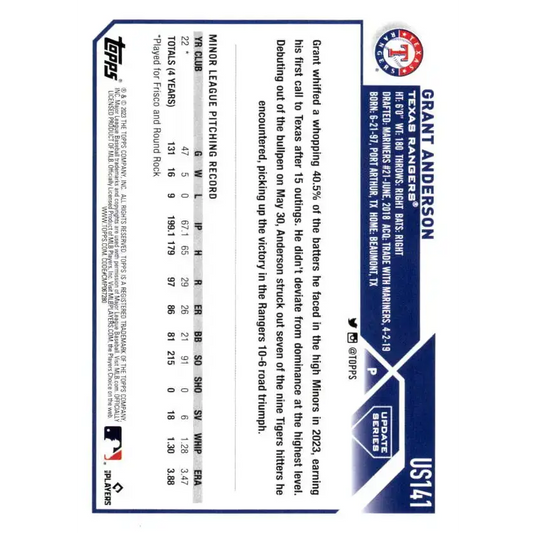 2023 Topps Update Series #US141 Grant Anderson NM-MT RC Rookie Texas Rangers Baseball Card
