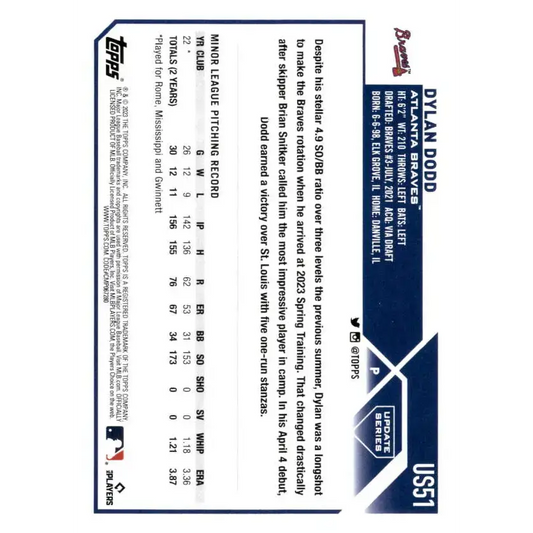 2023 Topps Update Series #US51 Dylan Dodd NM-MT RC Rookie Atlanta Braves Baseball Card