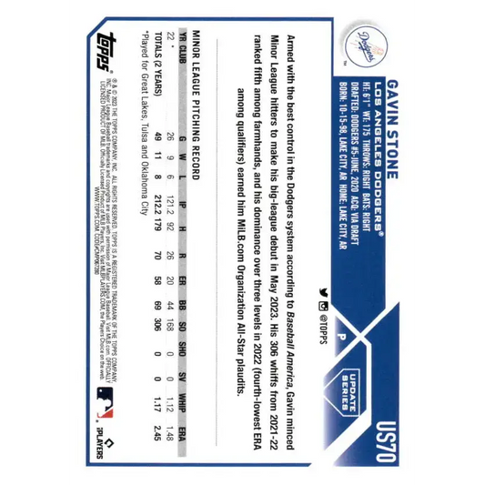 2023 Topps Update Series #US70 Gavin Stone NM-MT RC Rookie Los Angeles Dodgers Baseball Card
