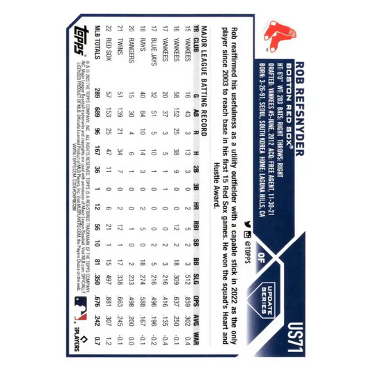 2023 Topps Update Series #US71 Rob Refsnyder NM-MT Boston Red Sox Baseball Card